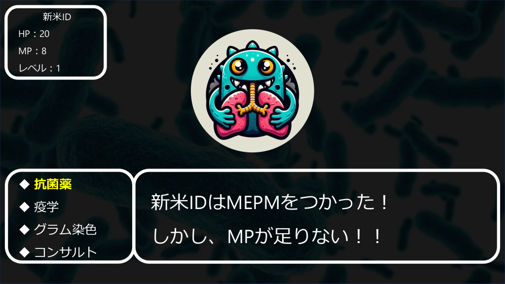 新米ID HP:20 MP:8 レベル:1 ◆ 抗菌薬 ◆ 疫学 新米IDはMEPMをつかった! ◆ グラム染色 しかし、MPが足りない!! ◆ コンサルト #9.