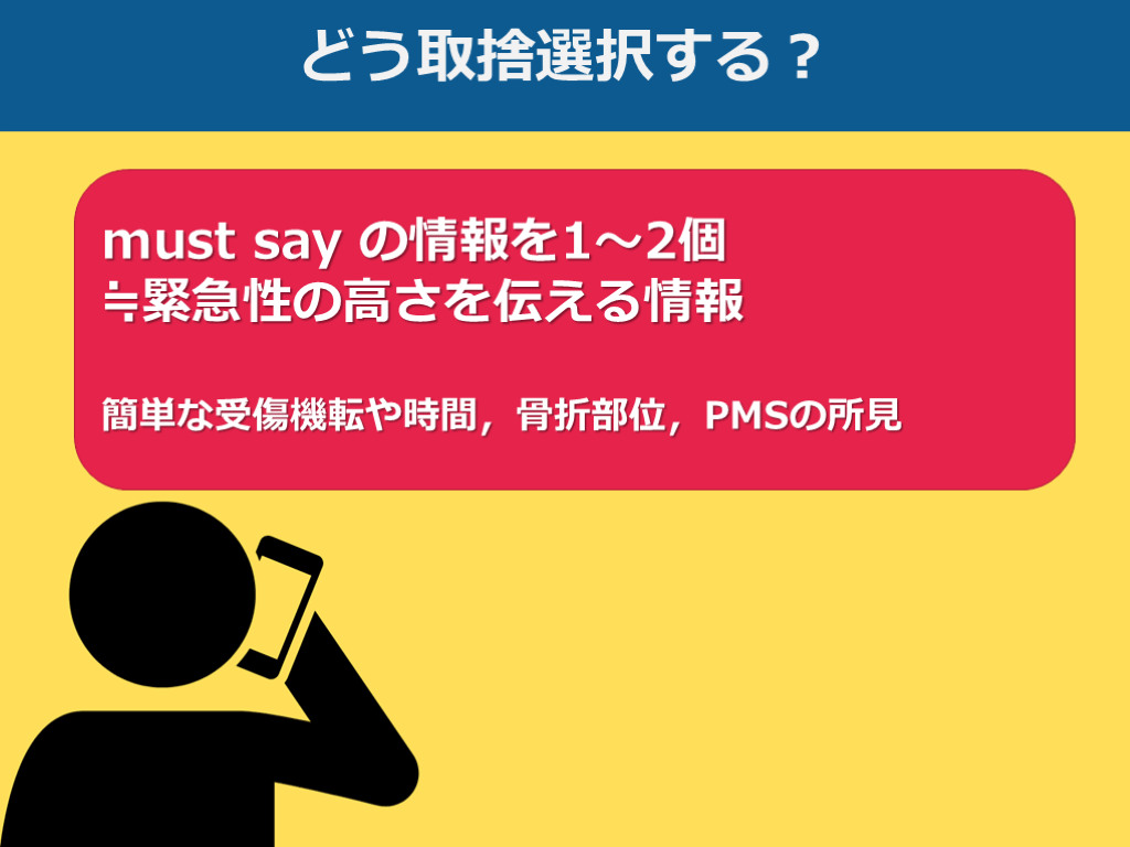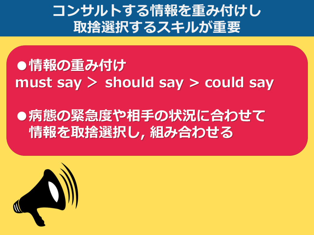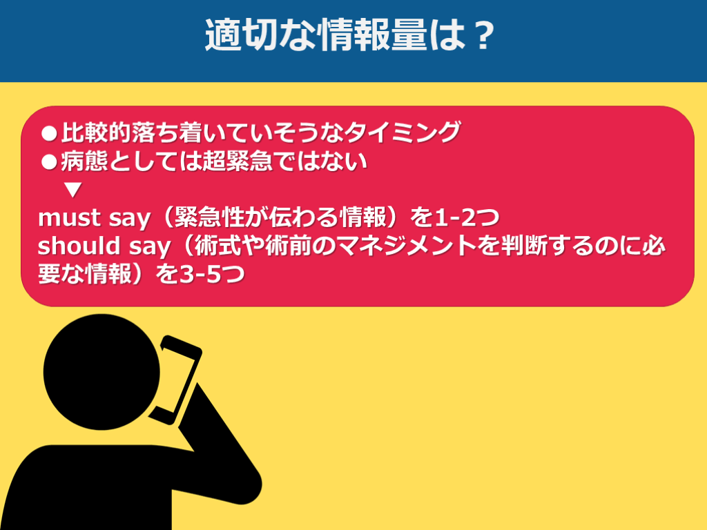 must say(緊急性が伝わる情報)を1-2つshould say(術式や術前のマネジメントを判断するのに必要な情報)を3-5つ