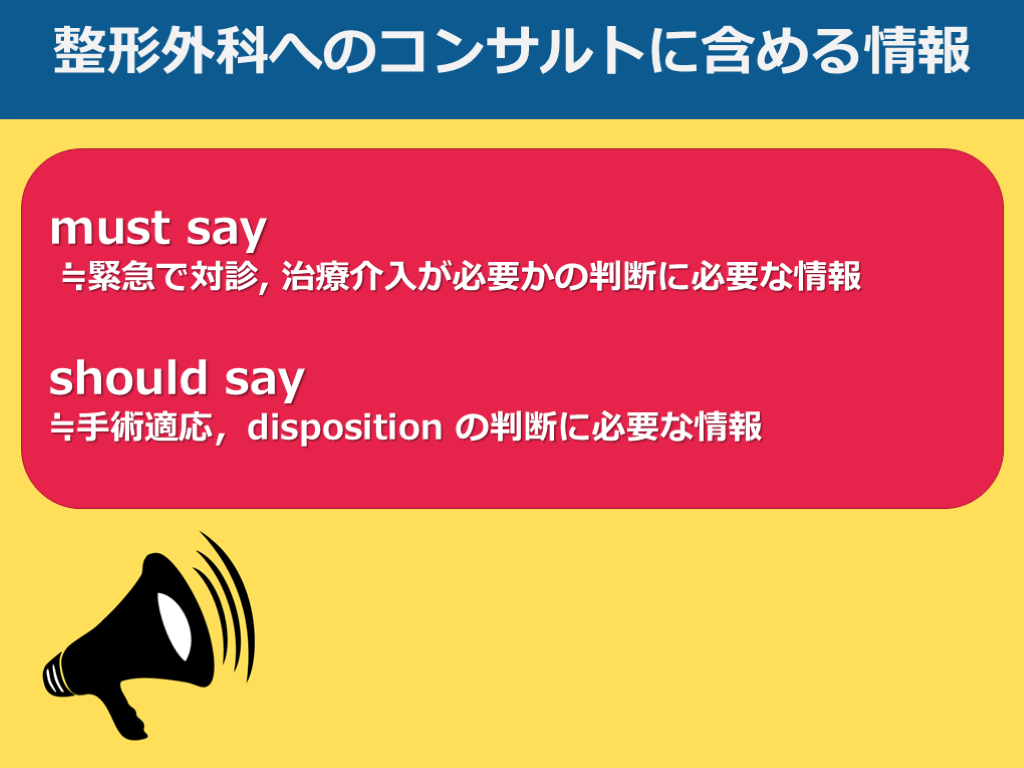 ≒手術適応,disposition の判断に必要な情報 整形外科へのコンサルトに含める情報