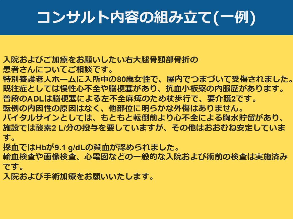 入院および手術加療をお願いいたします。 コンサルト内容の組み立て(一例)