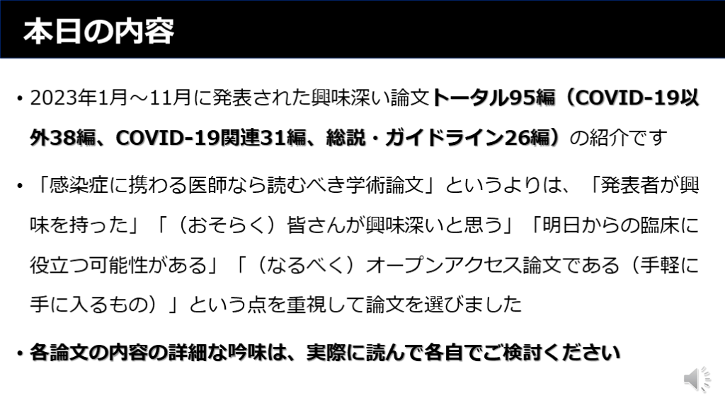 #2. 2023年1月~11月に発表された興味深い論文トータル95編(COVID-19以外38編、COVID-19関連31編、総説・ガイドライン26編)の紹介です