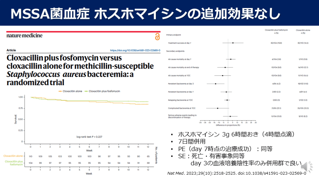 #7. MSSA菌血症 ホスホマイシンの追加効果なし ホスホマイシン 3g 6時間おき(4時間点滴)