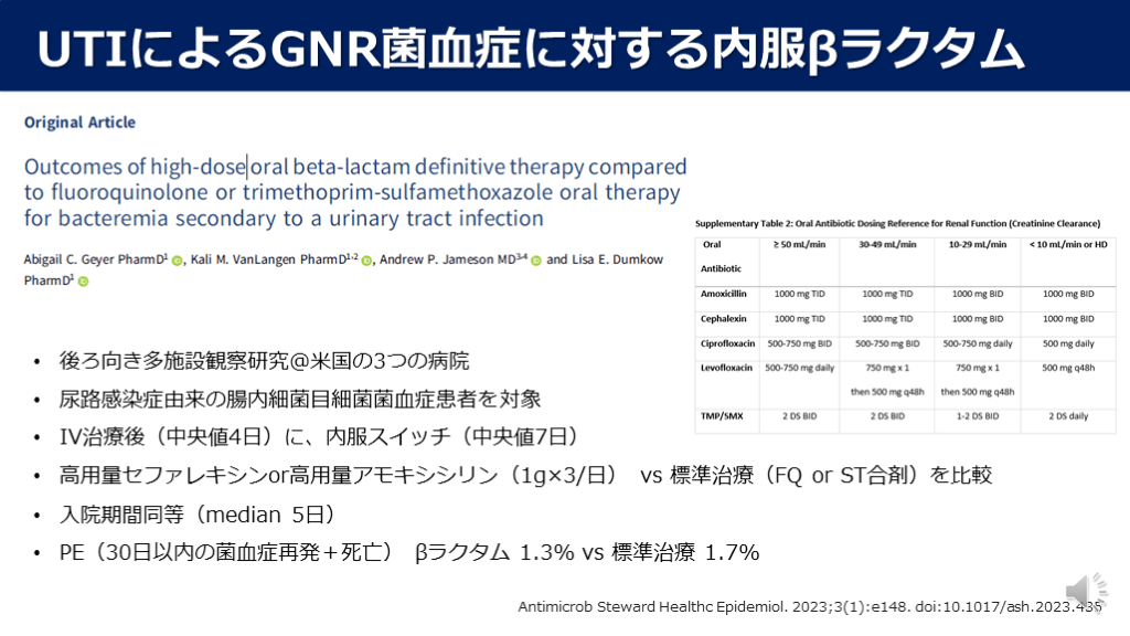 #11. UTIによるGNR菌血症に対する内服βラクタム Antimicrob Steward Healthc Epidemiol. 2023;3(1):e148. doi:10.1017/ash.2023.435 後ろ向き多施設観察研究@米国の3つの病院
