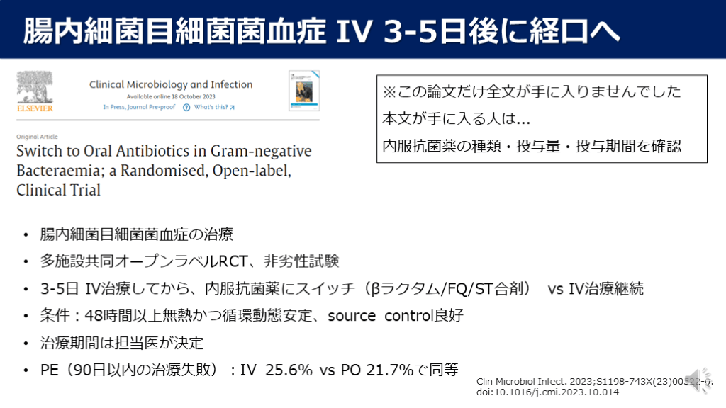 doi:10.1016/j.cmi.2023.04.026 ・早期の内服抗菌薬への変更を検討した研究はすべてバイアスの大きい観察研究である