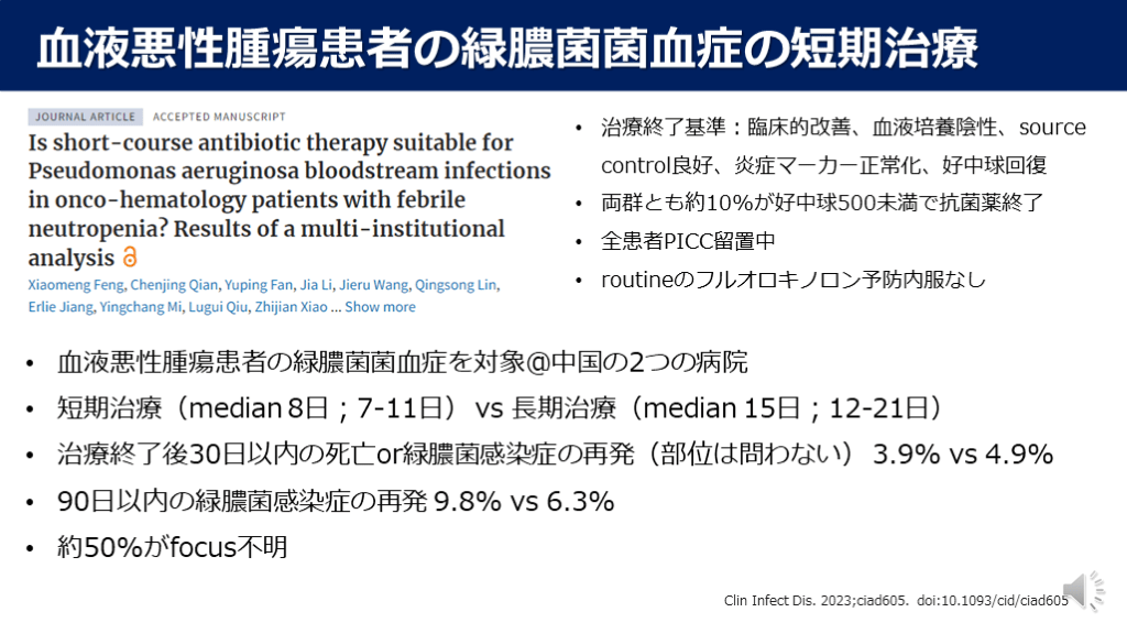 #14. 血液悪性腫瘍患者の緑膿菌菌血症の短期治療 Clin Infect Dis. 2023;ciad605. doi:10.1093/cid/ciad605 血液悪性腫瘍患者の緑膿菌菌血症を対象@中国の2つの病院