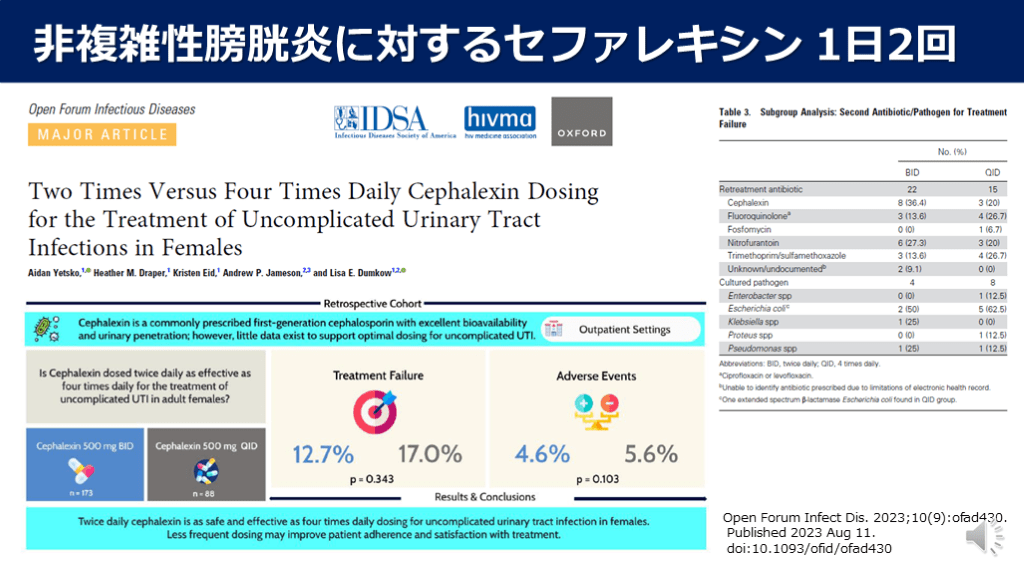 #15. 非複雑性膀胱炎に対するセファレキシン 1日2回 Open Forum Infect Dis. 2023;10(9):ofad430.