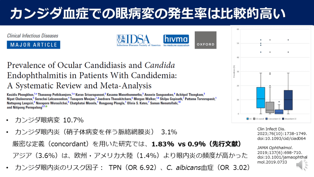 カンジダ眼内炎のリスク因子: TPN(OR 6.92)、C. albicans血症(OR 3.02) Clin Infect Dis. 2023;76(10):1738-1749.