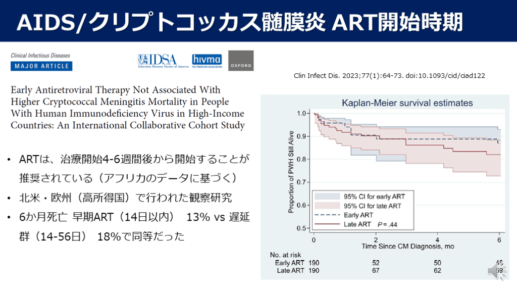 #21. AIDS/クリプトコッカス髄膜炎 ART開始時期 Clin Infect Dis. 2023;77(1):64-73. doi:10.1093/cid/ciad122 ARTは、治療開始4-6週間後から開始することが推奨されている(アフリカのデータに基づく)