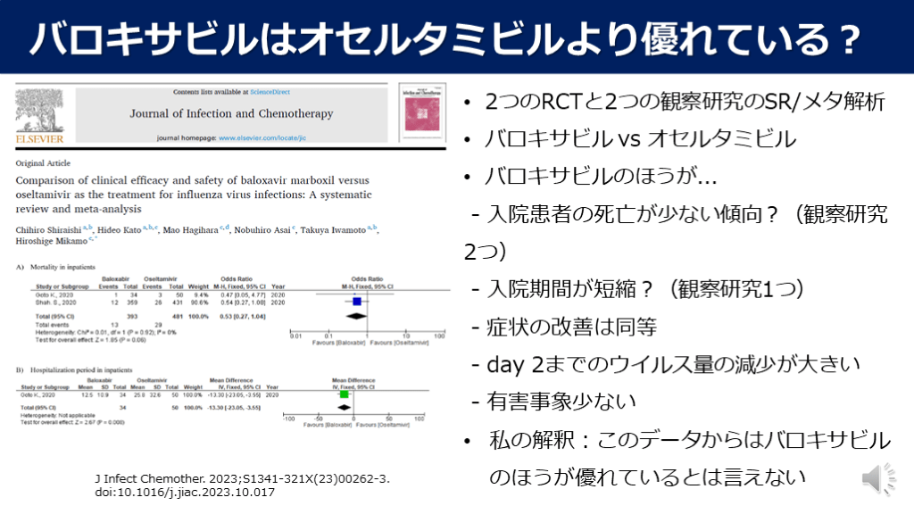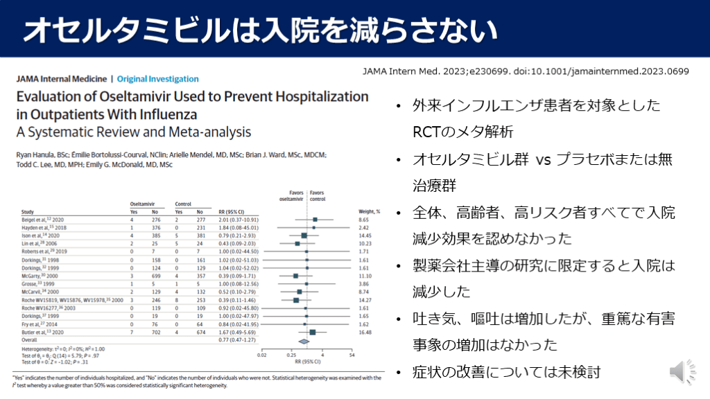 #24. オセルタミビルは入院を減らさない JAMA Intern Med. 2023;e230699. doi:10.1001/jamainternmed.2023.0699 外来インフルエンザ患者を対象としたRCTのメタ解析