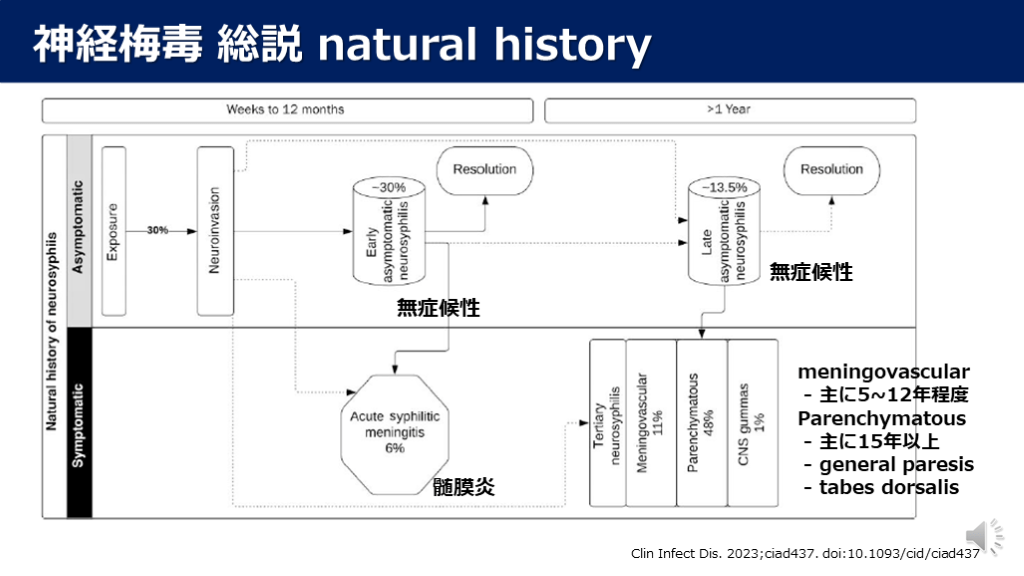 #104. 神経梅毒 総説 natural history Clin Infect Dis. 2023;ciad437. doi:10.1093/cid/ciad437 髄膜炎 無症候性 無症候性 meningovascular