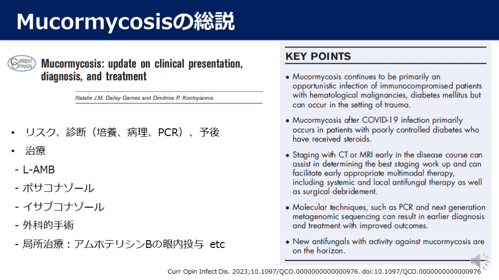 #107. Mucormycosisの総説 Curr Opin Infect Dis. 2023;10.1097/QCO.0000000000000976. doi:10.1097/QCO.0000000000000976 リスク、診断(培養、病理、PCR)、予後