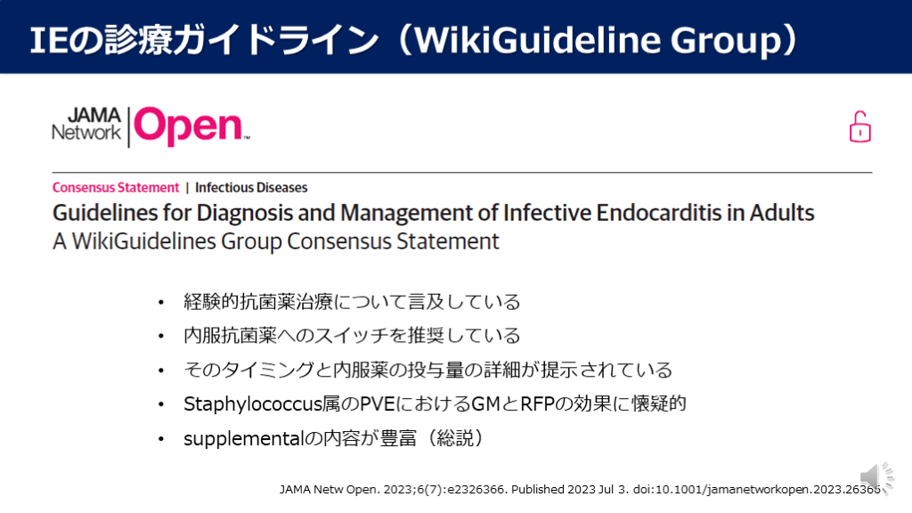 #113. IEの診療ガイドライン(WikiGuideline Group) JAMA Netw Open. 2023;6(7):e2326366. Published 2023 Jul 3. doi:10.1001/jamanetworkopen.2023.26366 経験的抗菌薬治療について言及している