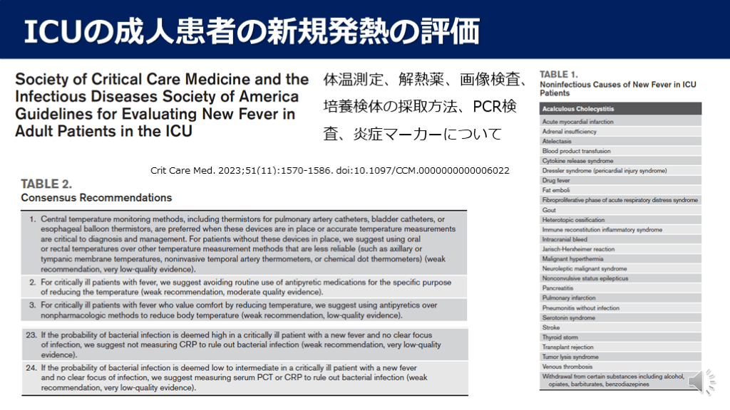 #118. ICUの成人患者の新規発熱の評価 Crit Care Med. 2023;51(11):1570-1586. doi:10.1097/CCM.0000000000006022 体温測定、解熱薬、画像検査、培養検体の採取方法、PCR検査、炎症マーカーについて