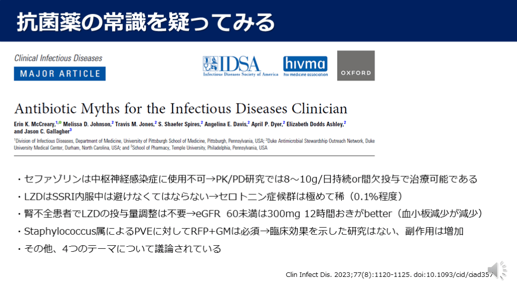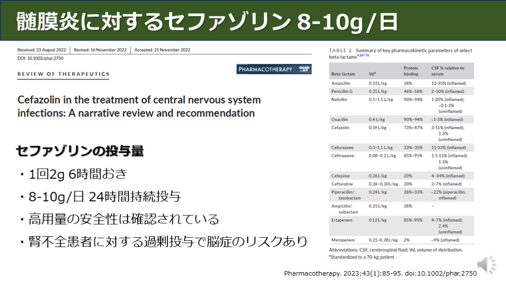 #123. 抗菌薬の常識を疑ってみる Clin Infect Dis. 2023;77(8):1120-1125. doi:10.1093/cid/ciad357 ・セファゾリンは中枢神経感染症に使用不可→PK/PD研究では8~10g/日持続or間欠投与で治療可能である