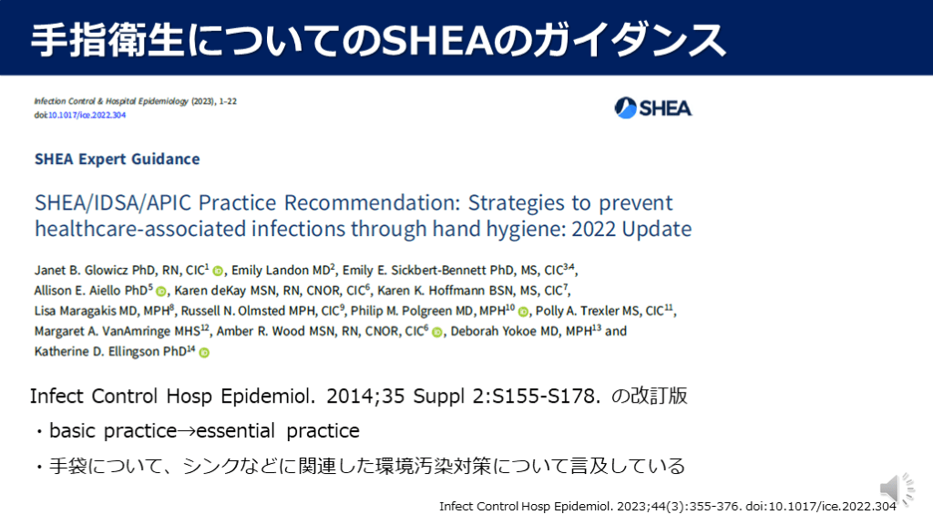 #126. 手指衛生についてのSHEAのガイダンス Infect Control Hosp Epidemiol. 2023;44(3):355-376. doi:10.1017/ice.2022.304 Infect Control Hosp Epidemiol. 2014;35 Suppl 2:S155-S178. の改訂版