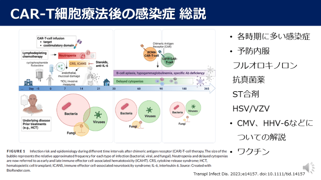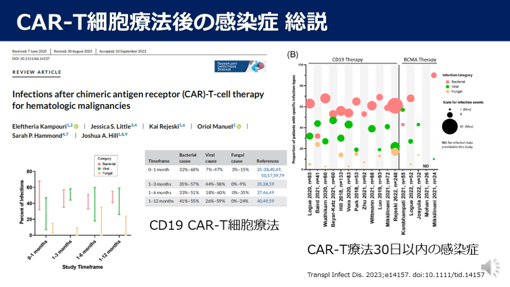 #132. CAR-T細胞療法後の感染症 総説 Transpl Infect Dis. 2023;e14157. doi:10.1111/tid.14157 CAR-T療法30日以内の感染症 CD19 CAR-T細胞療法