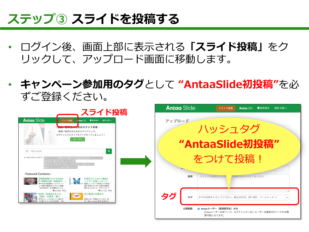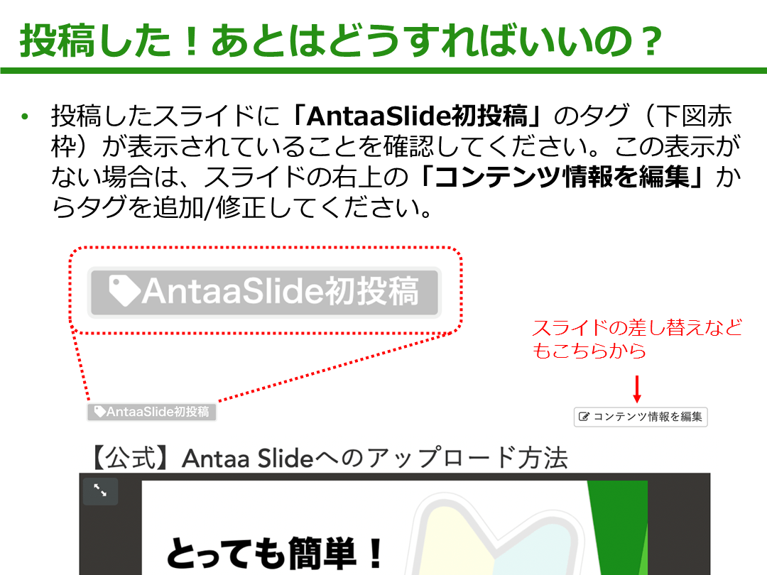参加方法は、"AntaaSlide初投稿"のタグをつけてスライドを投稿するだけ。