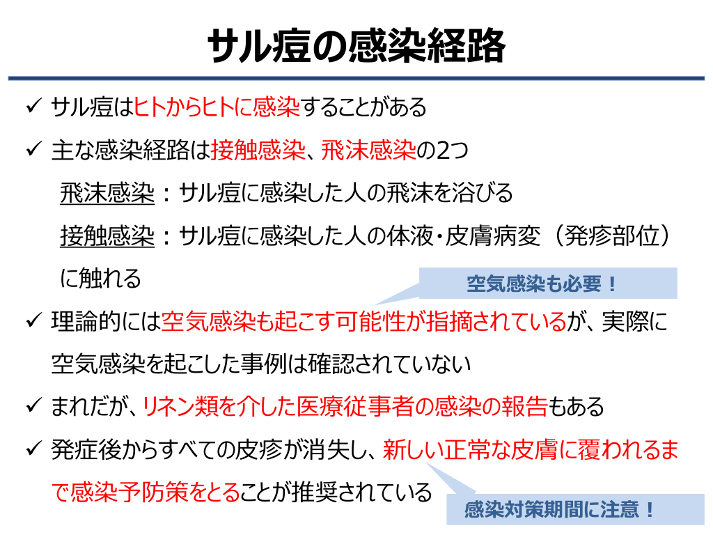#10. サル痘の感染経路 ✓ サル痘はヒトからヒトに感染することがある ✓ 主な感染経路は接触感染、飛沫感染の2つ 飛沫感染:サル痘に感染した人の飛沫を浴びる 接触感染:サル痘に感染した人の体液・皮膚病変(発疹部位) に触れる 空気感染も必要! ✓ 理論的には空気感染も起こす可能性が指摘されているが、実際に 空気感染を起こした事例は確認されていない ✓ まれだが、リネン類を介した医療従事者の感染の報告もある ✓ 発症後からすべての皮疹が消失し、新しい正常な皮膚に覆われるま で感染予防策をとることが推奨されている 感染対策期間に注意!
