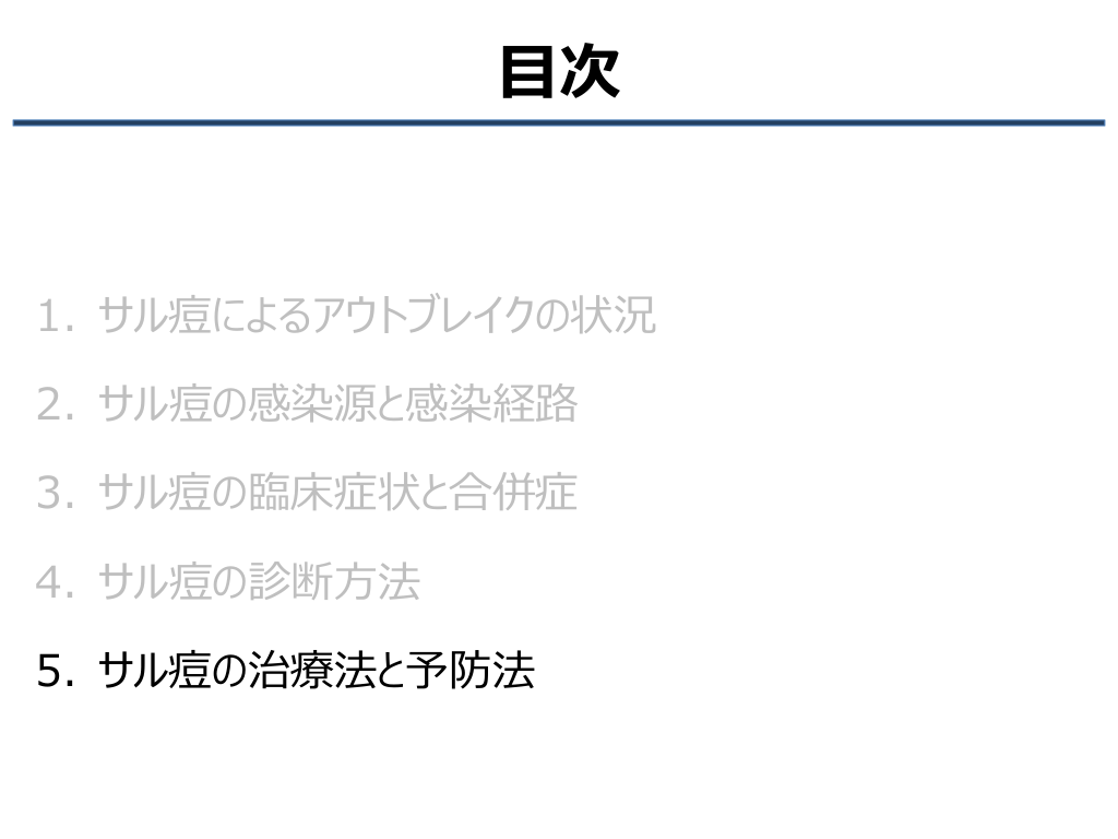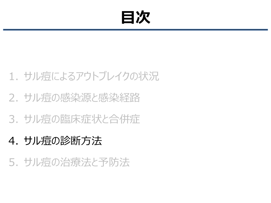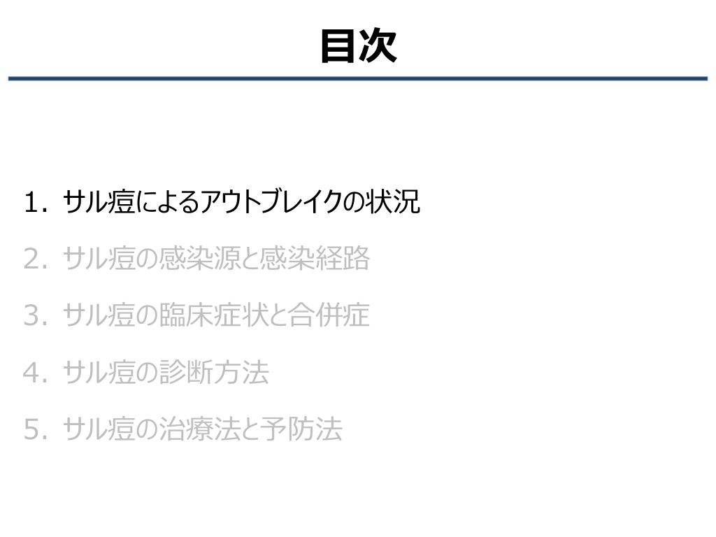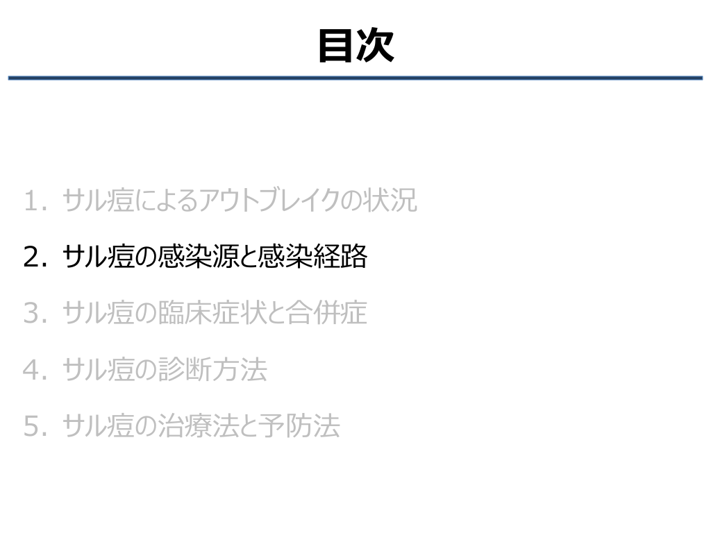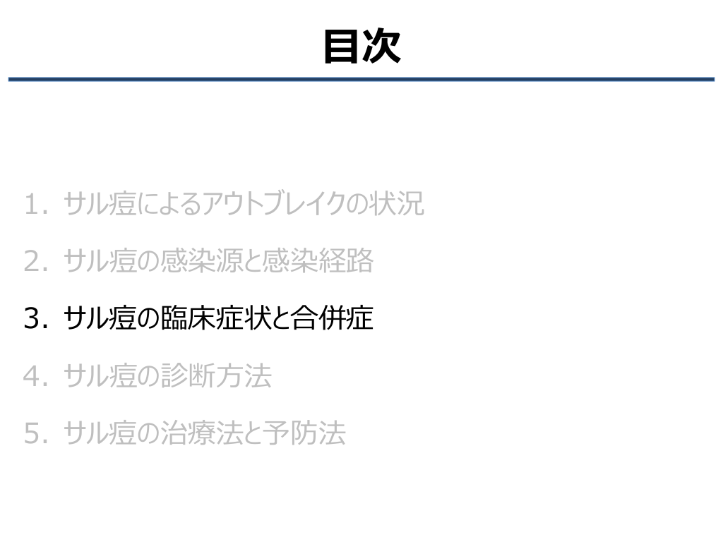 #3. 目次 1. サル痘によるアウトブレイクの状況 2. サル痘の感染源と感染経路 3. サル痘の臨床症状と合併症 4. サル痘の診断方法 5. サル痘の治療法と予防法