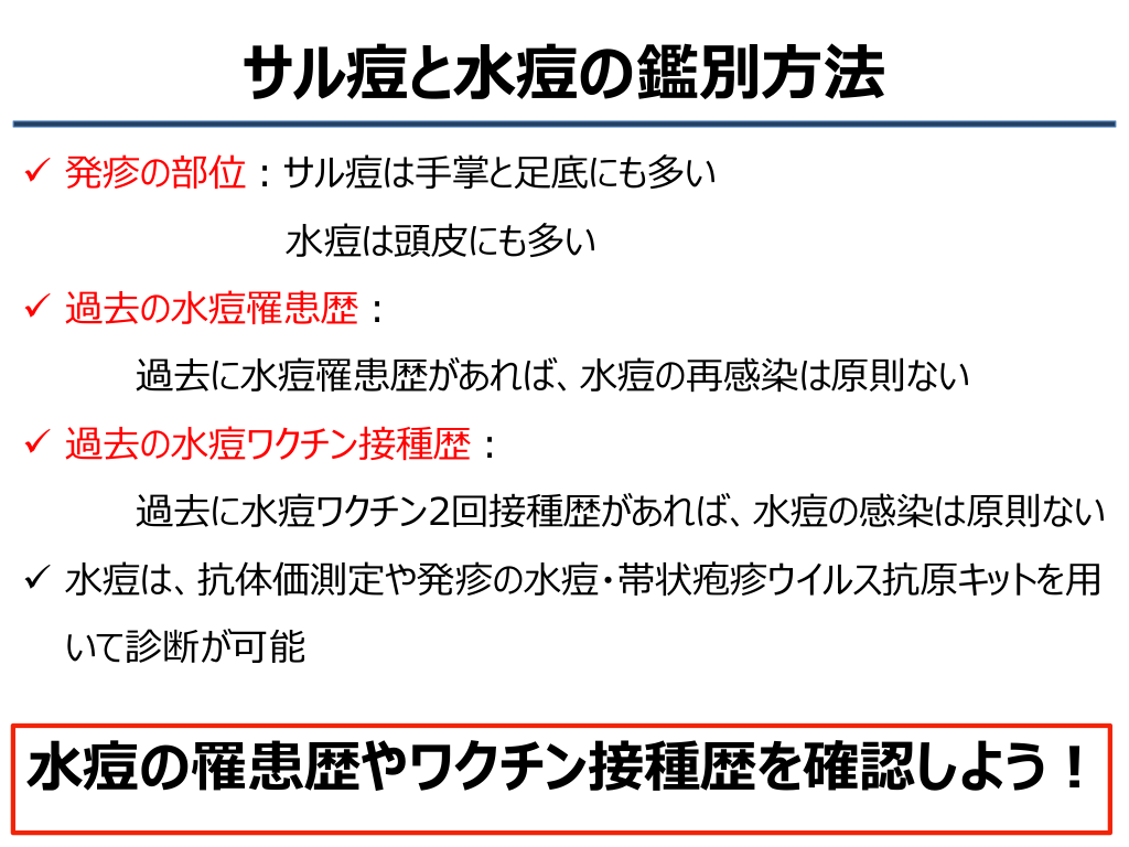 #16. サル痘と水痘の鑑別方法 ✓ 発疹の部位:サル痘は手掌と足底にも多い 水痘は頭皮にも多い ✓ 過去の水痘罹患歴: 過去に水痘罹患歴があれば、水痘の再感染は原則ない ✓ 過去の水痘ワクチン接種歴: 過去に水痘ワクチン2回接種歴があれば、水痘の感染は原則ない ✓ 水痘は、抗体価測定や発疹の水痘・帯状疱疹ウイルス抗原キットを用 いて診断が可能 水痘の罹患歴やワクチン接種歴を確認しよう!