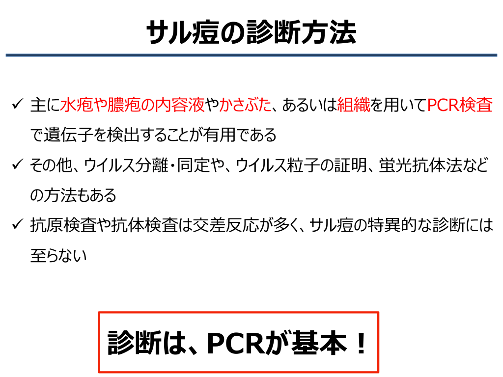 #18. サル痘の診断方法 ✓ 主に水疱や膿疱の内容液やかさぶた、あるいは組織を用いてPCR検査 で遺伝子を検出することが有用である ✓ その他、ウイルス分離・同定や、ウイルス粒子の証明、蛍光抗体法など の方法もある ✓ 抗原検査や抗体検査は交差反応が多く、サル痘の特異的な診断には 至らない 診断は、PCRが基本!