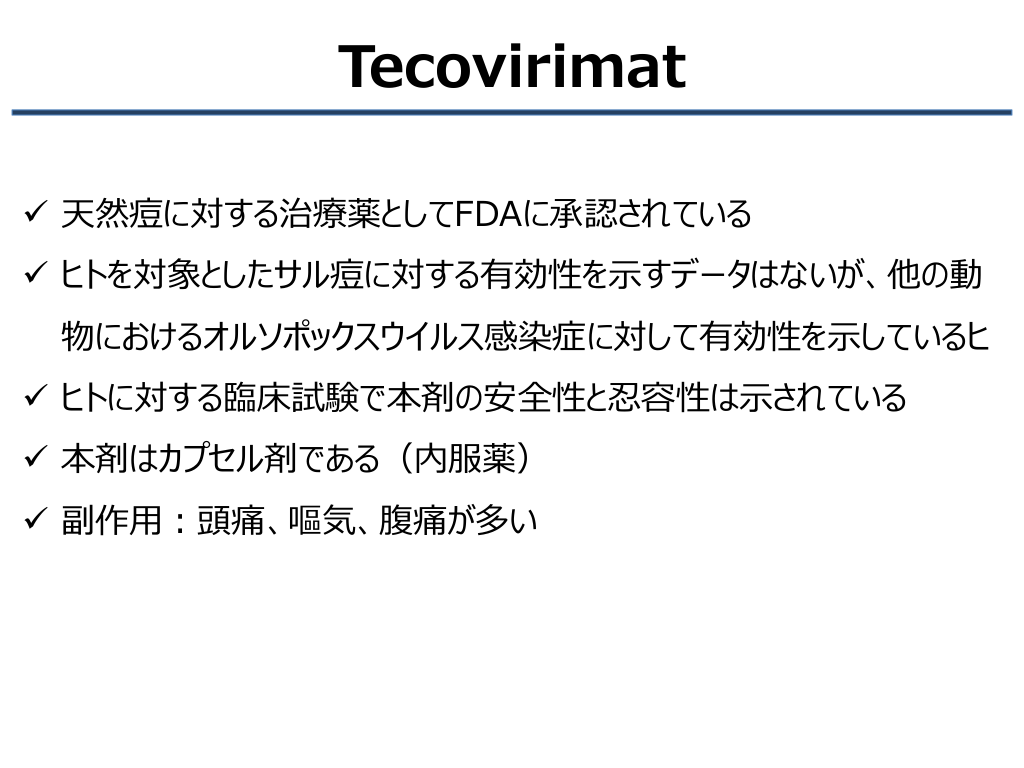 #22. Tecovirimat ✓ 天然痘に対する治療薬としてFDAに承認されている ✓ ヒトを対象としたサル痘に対する有効性を示すデータはないが、他の動 物におけるオルソポックスウイルス感染症に対して有効性を示しているヒ ✓ ヒトに対する臨床試験で本剤の安全性と忍容性は示されている ✓ 本剤はカプセル剤である(内服薬) ✓ 副作用:頭痛、嘔気、腹痛が多い