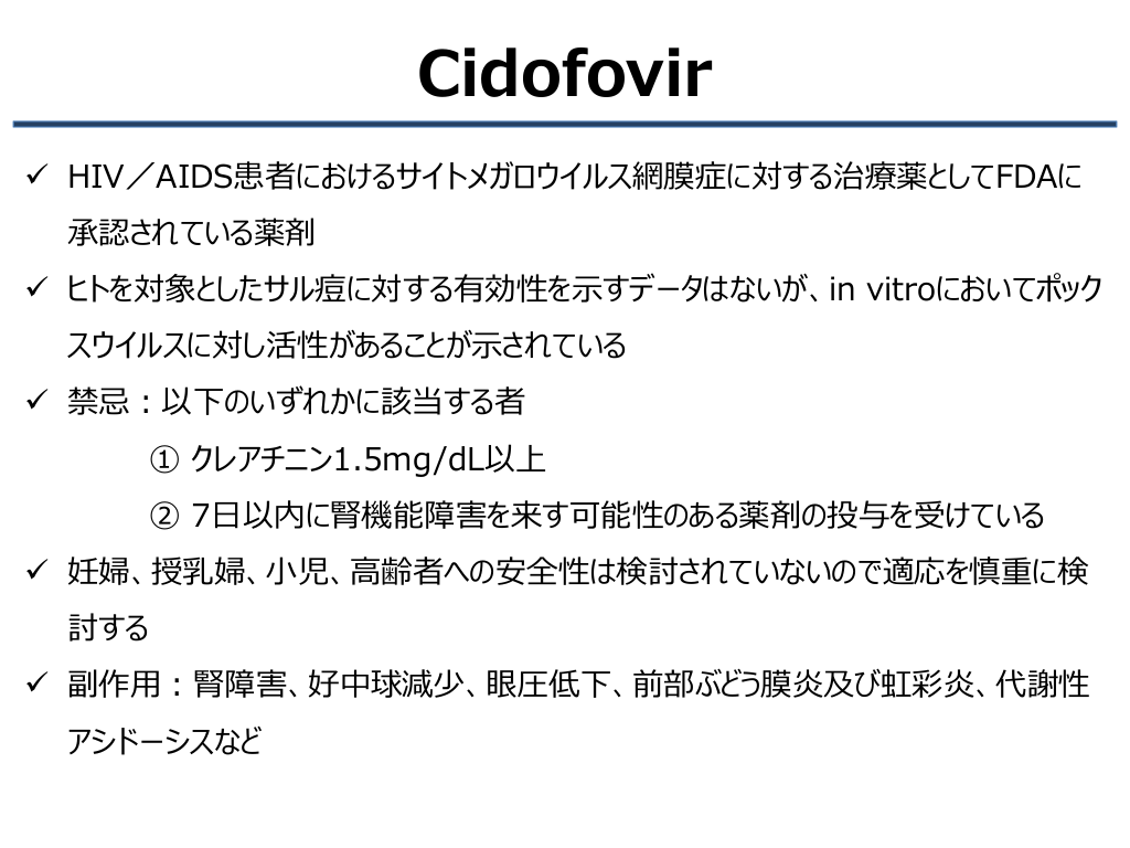 #23. Cidofovir ✓ HIV/AIDS患者におけるサイトメガロウイルス網膜症に対する治療薬としてFDAに 承認されている薬剤 ✓ ヒトを対象としたサル痘に対する有効性を示すデータはないが、in vitroにおいてポック スウイルスに対し活性があることが示されている ✓ 禁忌:以下のいずれかに該当する者 ① クレアチニン1.5mg/dL以上 ② 7日以内に腎機能障害を来す可能性のある薬剤の投与を受けている ✓ 妊婦、授乳婦、小児、高齢者への安全性は検討されていないので適応を慎重に検 討する ✓ 副作用:腎障害、好中球減少、眼圧低下、前部ぶどう膜炎及び虹彩炎、代謝性 アシドーシスなど
