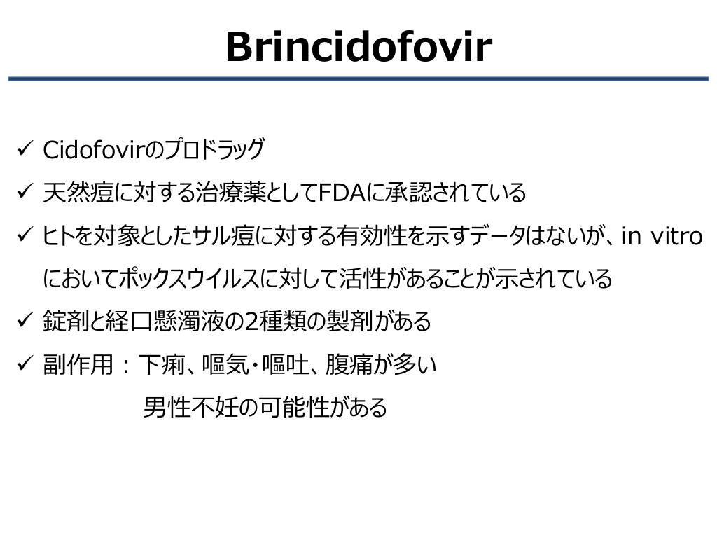 #24. Brincidofovir ✓ Cidofovirのプロドラッグ ✓ 天然痘に対する治療薬としてFDAに承認されている ✓ ヒトを対象としたサル痘に対する有効性を示すデータはないが、in vitro においてポックスウイルスに対して活性があることが示されている ✓ 錠剤と経口懸濁液の2種類の製剤がある ✓ 副作用:下痢、嘔気・嘔吐、腹痛が多い 男性不妊の可能性がある