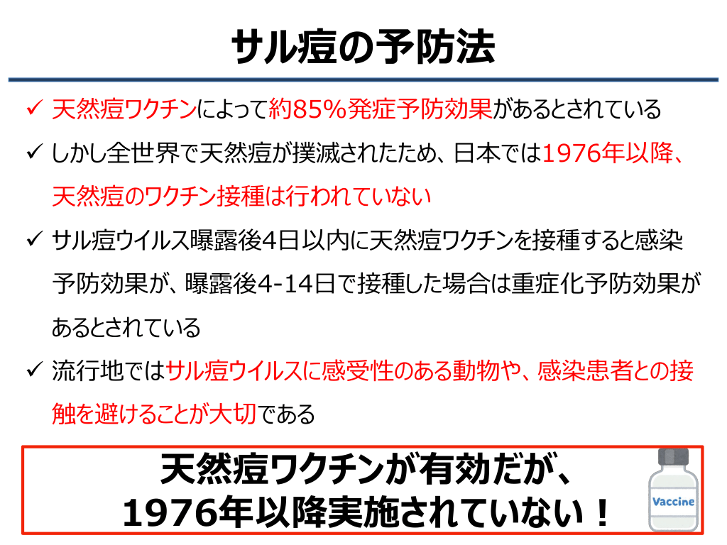 #25. サル痘の予防法 ✓ 天然痘ワクチンによって約85%発症予防効果があるとされている ✓ しかし全世界で天然痘が撲滅されたため、日本では1976年以降、 天然痘のワクチン接種は行われていない ✓ サル痘ウイルス曝露後4日以内に天然痘ワクチンを接種すると感染 予防効果が、曝露後4-14日で接種した場合は重症化予防効果が あるとされている ✓ 流行地ではサル痘ウイルスに感受性のある動物や、感染患者との接 触を避けることが大切である 天然痘ワクチンが有効だが、 1976年以降実施されていない!