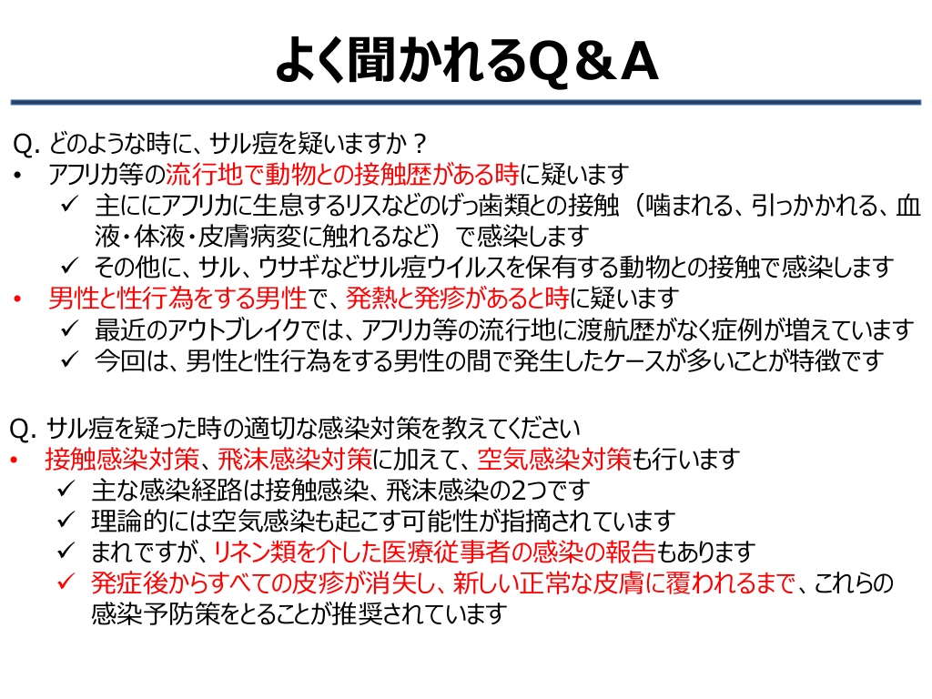 #26. よく聞かれるQ&A Q. どのような時に、サル痘を疑いますか? • アフリカ等の流行地で動物との接触歴がある時に疑います ✓ 主ににアフリカに生息するリスなどのげっ歯類との接触(噛まれる、引っかかれる、血 液・体液・皮膚病変に触れるなど)で感染します ✓ その他に、サル、ウサギなどサル痘ウイルスを保有する動物との接触で感染します • 男性と性行為をする男性で、発熱と発疹があると時に疑います ✓ 最近のアウトブレイクでは、アフリカ等の流行地に渡航歴がなく症例が増えています ✓ 今回は、男性と性行為をする男性の間で発生したケースが多いことが特徴です Q. サル痘を疑った時の適切な感染対策を教えてください • 接触感染対策、飛沫感染対策に加えて、空気感染対策も行います ✓ 主な感染経路は接触感染、飛沫感染の2つです ✓ 理論的には空気感染も起こす可能性が指摘されています ✓ まれですが、リネン類を介した医療従事者の感染の報告もあります ✓ 発症後からすべての皮疹が消失し、新しい正常な皮膚に覆われるまで、これらの 感染予防策をとることが推奨されています