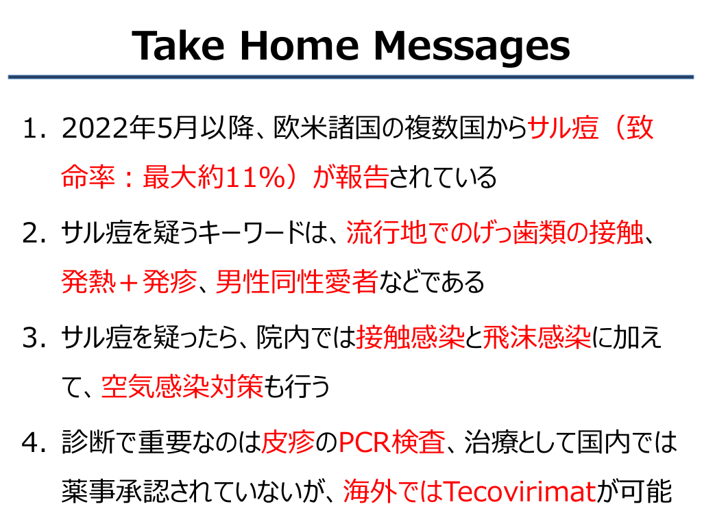 #2. Take Home Messages 1. 2022年5月以降、欧米諸国の複数国からサル痘(致 命率:最大約11%)が報告されている 2. サル痘を疑うキーワードは、流行地でのげっ歯類の接触、 発熱+発疹、男性同性愛者などである 3. サル痘を疑ったら、院内では接触感染と飛沫感染に加え て、空気感染対策も行う 4. 診断で重要なのは皮疹のPCR検査、治療として国内では 薬事承認されていないが、海外ではTecovirimatが可能