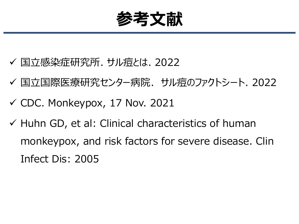 #28. 参考文献 ✓ 国立感染症研究所. サル痘とは. 2022 ✓ 国立国際医療研究センター病院. サル痘のファクトシート. 2022 ✓ CDC. Monkeypox, 17 Nov. 2021 ✓ Huhn GD, et al: Clinical characteristics of human monkeypox, and risk factors for severe disease. Clin Infect Dis: 2005