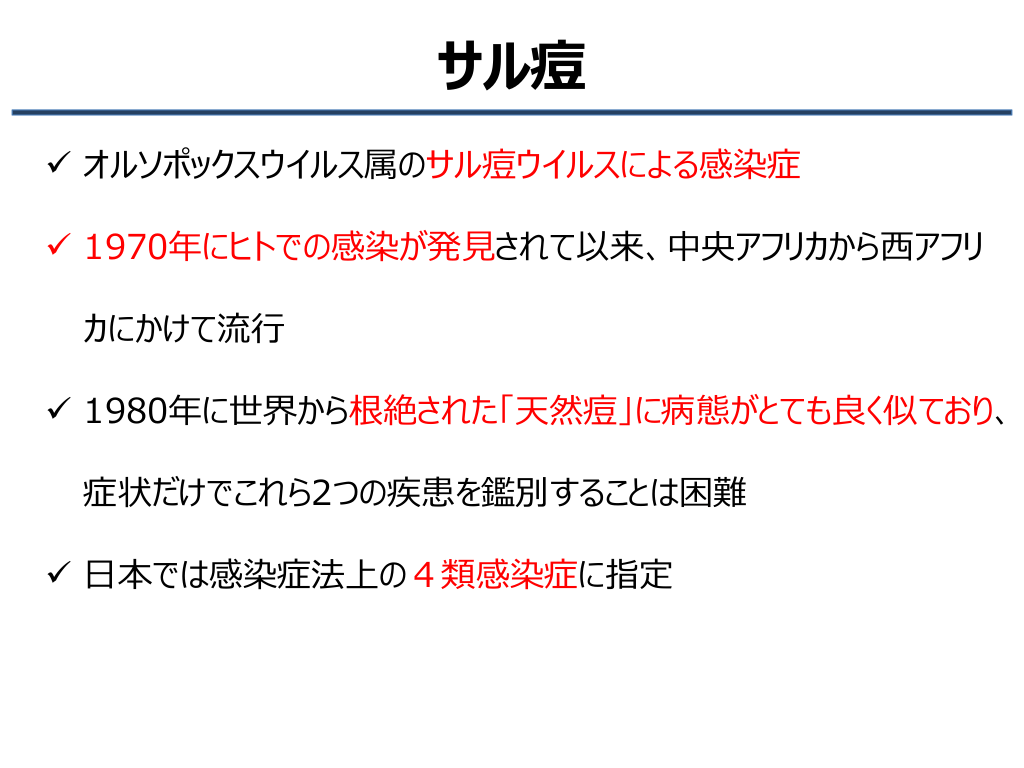 #4. サル痘 ✓ オルソポックスウイルス属のサル痘ウイルスによる感染症 ✓ 1970年にヒトでの感染が発見されて以来、中央アフリカから西アフリ カにかけて流行 ✓ 1980年に世界から根絶された「天然痘」に病態がとても良く似ており、 症状だけでこれら2つの疾患を鑑別することは困難 ✓ 日本では感染症法上の4類感染症に指定