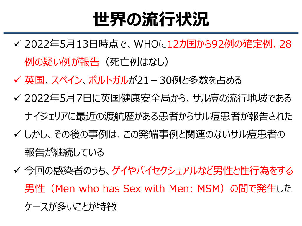 #5. 世界の流行状況 ✓ 2022年5月13日時点で、WHOに12カ国から92例の確定例、28 例の疑い例が報告(死亡例はなし) ✓ 英国、スペイン、ポルトガルが21-30例と多数を占める ✓ 2022年5月7日に英国健康安全局から、サル痘の流行地域である ナイジェリアに最近の渡航歴がある患者からサル痘患者が報告された ✓ しかし、その後の事例は、この発端事例と関連のないサル痘患者の 報告が継続している ✓ 今回の感染者のうち、ゲイやバイセクシュアルなど男性と性行為をする 男性(Men who has Sex with Men: MSM)の間で発生した ケースが多いことが特徴