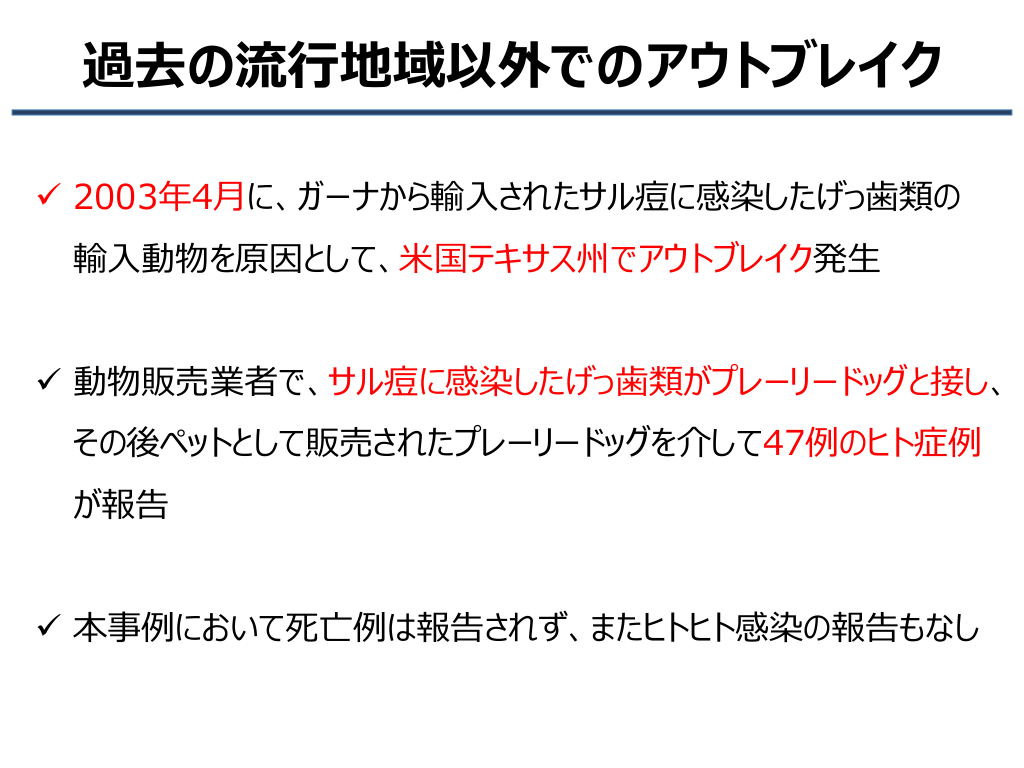 #6. 過去の流行地域以外でのアウトブレイク ✓ 2003年4月に、ガーナから輸入されたサル痘に感染したげっ歯類の 輸入動物を原因として、米国テキサス州でアウトブレイク発生 ✓ 動物販売業者で、サル痘に感染したげっ歯類がプレーリードッグと接し、 その後ペットとして販売されたプレーリードッグを介して47例のヒト症例 が報告 ✓ 本事例において死亡例は報告されず、またヒトヒト感染の報告もなし