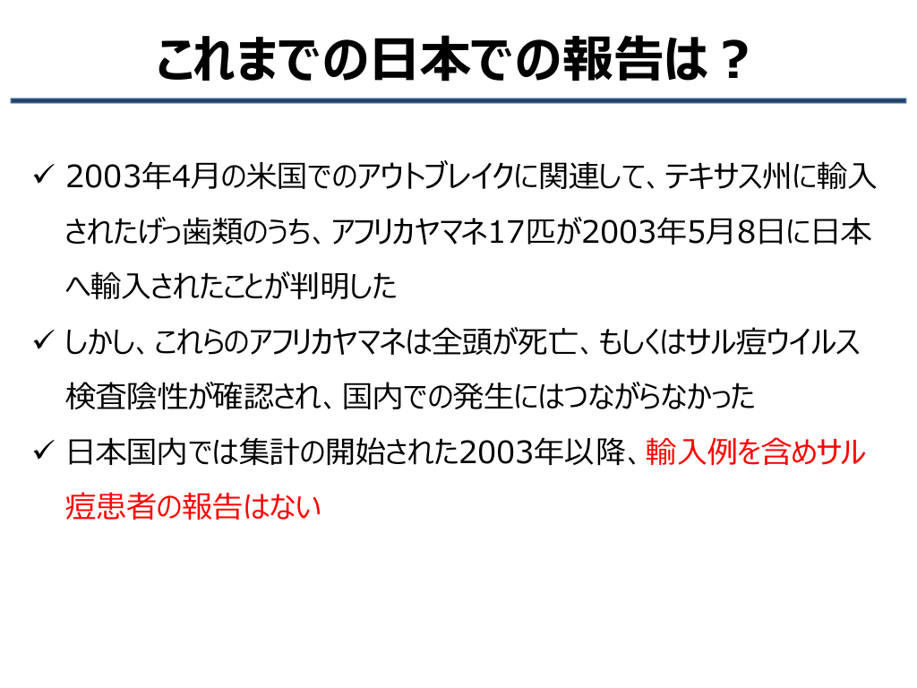 #7. これまでの日本での報告は? ✓ 2003年4月の米国でのアウトブレイクに関連して、テキサス州に輸入 されたげっ歯類のうち、アフリカヤマネ17匹が2003年5月8日に日本 へ輸入されたことが判明した ✓ しかし、これらのアフリカヤマネは全頭が死亡、もしくはサル痘ウイルス 検査陰性が確認され、国内での発生にはつながらなかった ✓ 日本国内では集計の開始された2003年以降、輸入例を含めサル 痘患者の報告はない