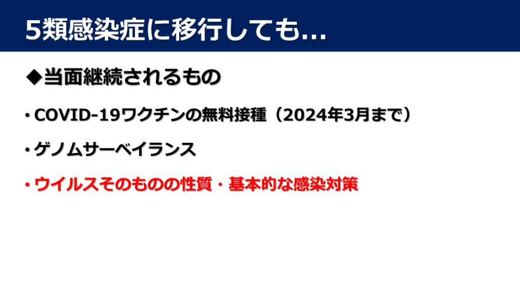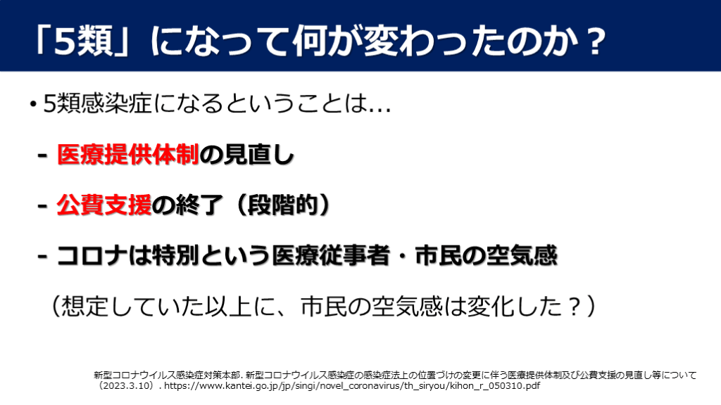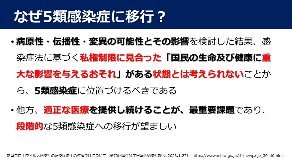 他方、適正な医療を提供し続けることが、最重要課題であり、段階的な5類感染症への移行が望ましい 新型コロナウイルス感染症の感染症法上の位置づけについて(第70回厚生科学審議会感染症部会, 2023.1.27). https://www.mhlw.go.jp/stf/newpage_30440.html なぜ5類感染症に移行? 5類感染症移行後の行政の役割と継続する対策 #7.