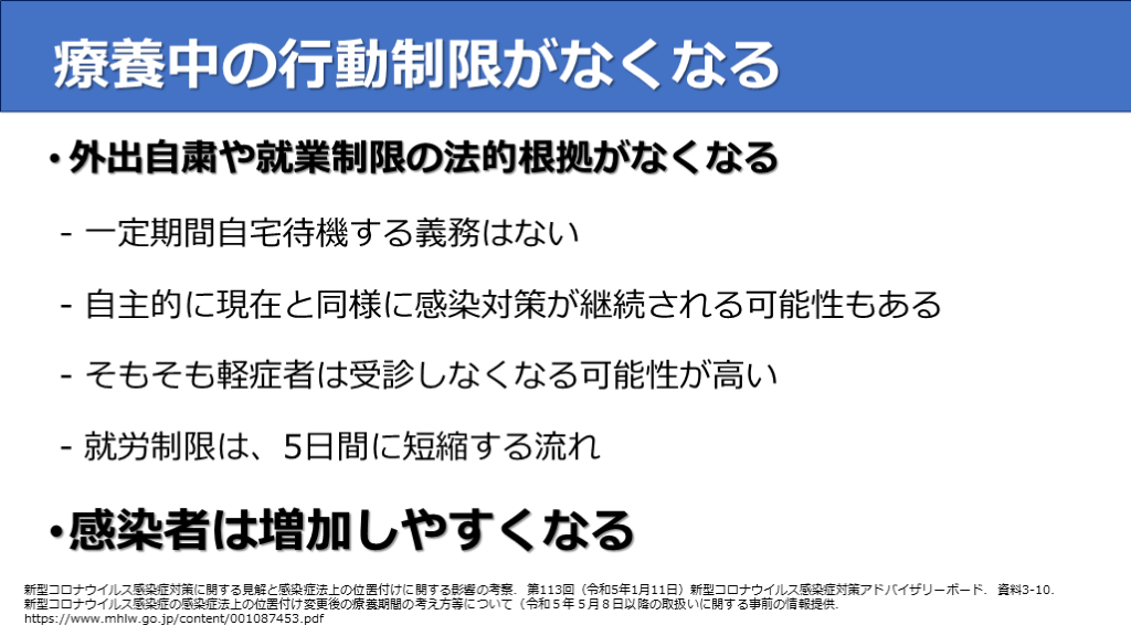 感染者は増加しやすくなる 新型コロナウイルス感染症対策に関する見解と感染症法上の位置付けに関する影響の考察. 第113回(令和5年1月11日)新型コロナウイルス感染症対策アドバイザリーボード. 資料3-10.