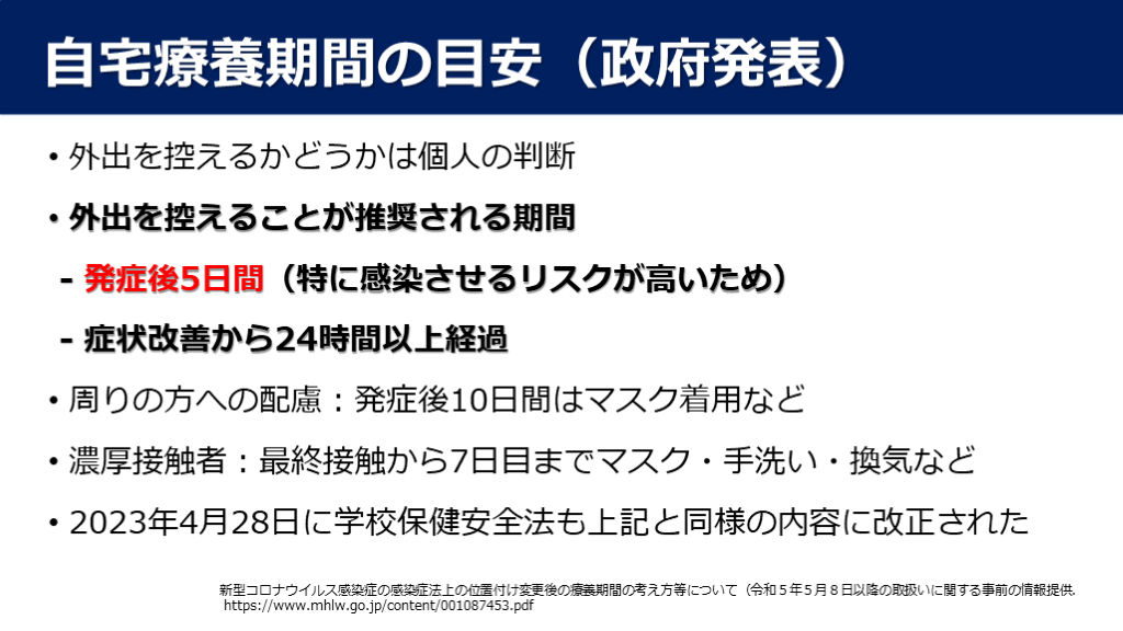 2023年4月28日に学校保健安全法も上記と同様の内容に改正された 新型コロナウイルス感染症の感染症法上の位置付け変更後の療養期間の考え方等について(令和5年5月8日以降の取扱いに関する事前の情報提供.