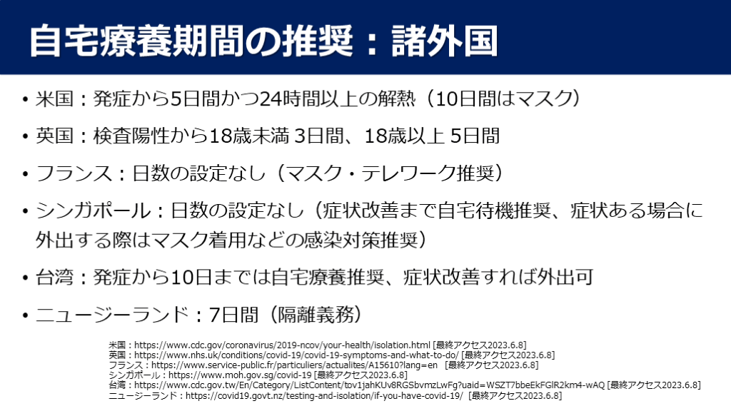 新型コロナウイルス感染症の感染症法上の位置付け変更後の療養期間の考え方等について(令和5年5月8日以降の取扱いに関する事前の情報提供. https://www.mhlw.go.jp/content/001087453.pdf 療養中の行動制限がなくなる 自宅療養期間の目安と国際的な比較 #14. 外出を控えるかどうかは個人の判断