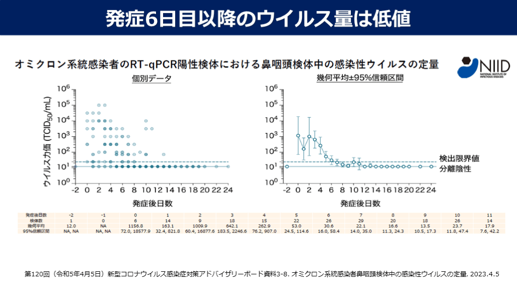 第120回(令和5年4月5日)新型コロナウイルス感染症対策アドバイザリーボード資料3-8. オミクロン系統感染者鼻咽頭検体中の感染性ウイルスの定量. 2023.4.5 発症6日目以降のウイルス量は低値 #19.