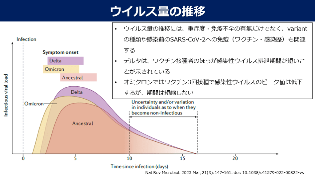 ウイルス量の推移 ウイルス量の推移には、重症度・免疫不全の有無だけでなく、variantの種類や感染前のSARS-CoV-2への免疫(ワクチン・感染歴)も関連する