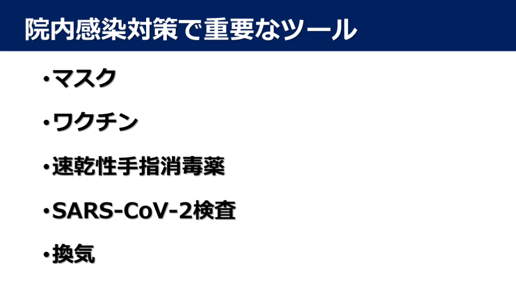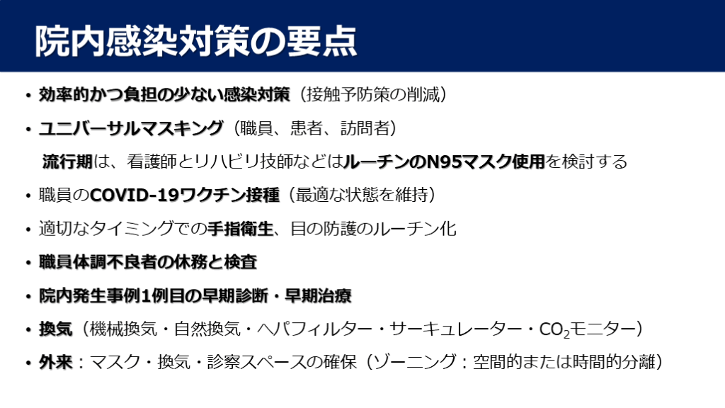 院内伝播抑制の基本は、ユニバーサルマスキング、手指衛生、患者・職員の症状スクリーニングと検査、体調不良の職員の休務、換気