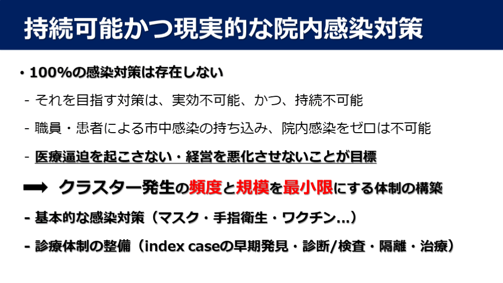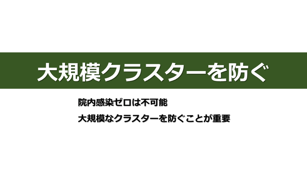 - 職員・患者による市中感染の持ち込み、院内感染をゼロは不可能