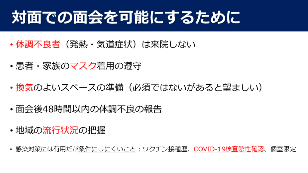 感染対策には有用だが条件にしにくいこと:ワクチン接種歴、COVID-19検査陰性確認、個室限定 対面での面会を可能にするために #31.
