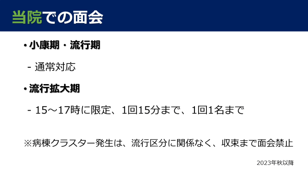 ワクチン接種がすすみ、医療提供体制の強化・重症化予防薬が開発されたこと、などから、面会者からの感染を防ぎつつ、患者や家族のQOLを考慮して、対面での面会が実施できるよう、流行状況をみながら、各医療機関でその方法・条件を検討する必要がある