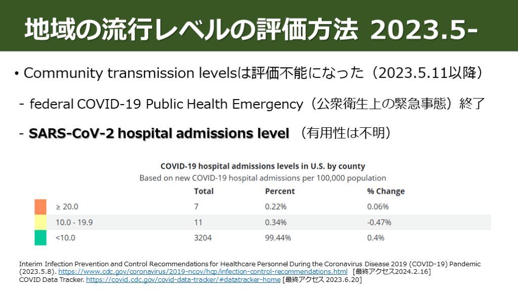 CDC. COVID-19 by County (Updated on May 11, 2023). https://www.cdc.gov/coronavirus/2019-ncov/your-health/covid-by-county.html 入院前スクリーニング検査の必要性の検討 流行状況に応じたスクリーニング検査の必要性 #110.