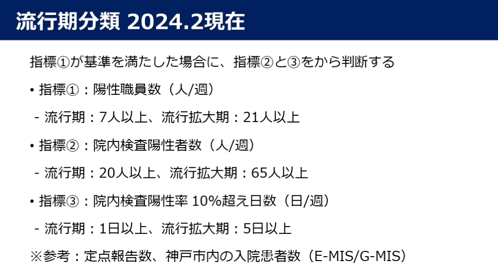非流行期は不要であるが、流行期は有用かもしれない(「流行期」の確立した定義なし:地域での発生率・数、定点報告、地域の入院患者数、下水中ウイルス濃度、院内検査陽性率、地域の新規入院患者数、職員の新規感染者数などを参考にする)