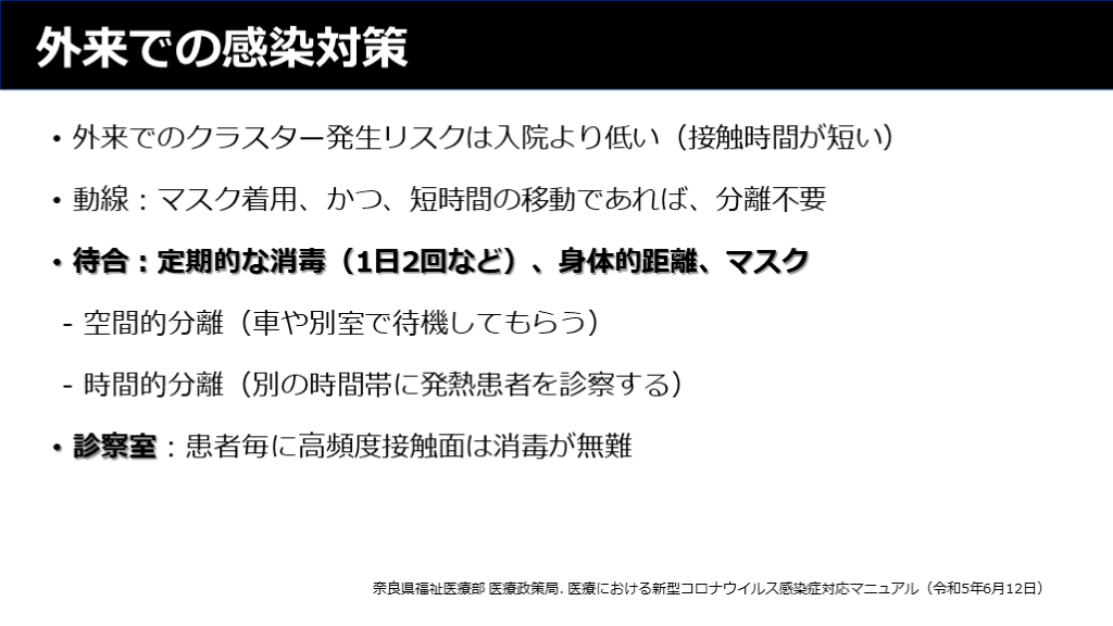 外来:マスク・換気・診察スペースの確保(ゾーニング:空間的または時間的分離) 院内感染対策の要点 #27.