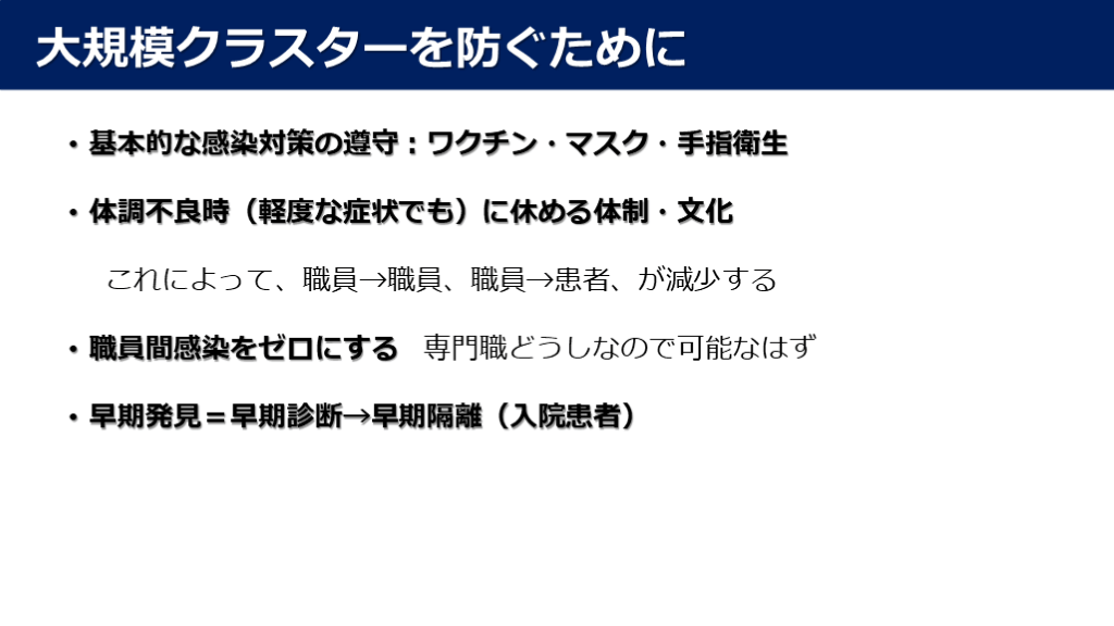 病院機能を維持するためにも、医療従事者の大規模クラスターは防ぎたい